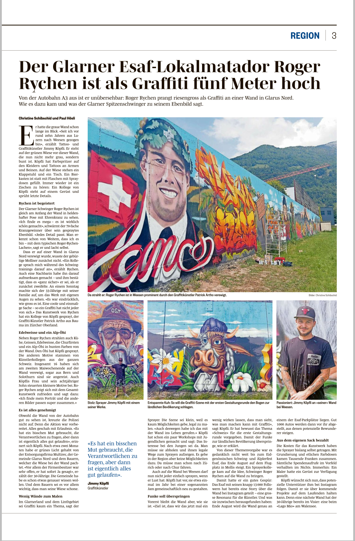 Roger Rychen riesengross dargestellt an einer Wand in Weesen. Dieses immense Graffiti haben wir dem Künstler Patrick Artho zu verdanken.